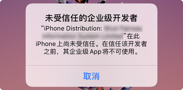 4.点击进入相应的企业级应用后,点击信任此应用,再在接下来弹框点击信任,返回桌面后即可正常使用APP。